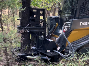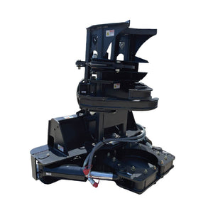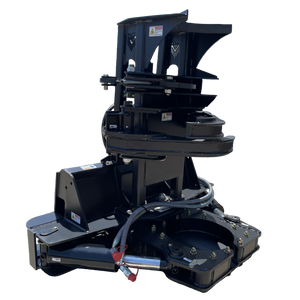 Forestry tree shear with 16″ cut, dual grapple arms for precision cut, AR400 milled bolt-on blade, and 33% faster shear speed, engineered for skid steer clearing operations.