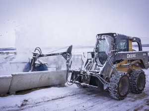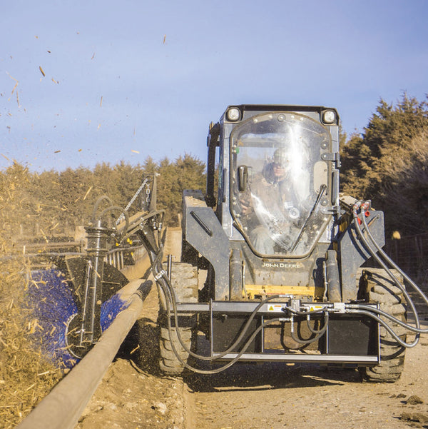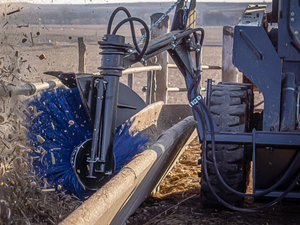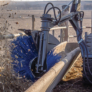 - Hydraulic-driven broom clears snow, dirt, and feed from bunkers.
