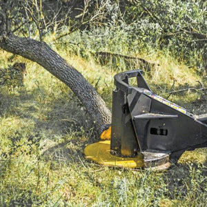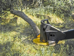 Maxx Tree Saw for skid steers, 38″ disk, 14″ cutting diameter, high-torque piston motor delivers 40% more torque, fixed or swing boom, with optional 5-gallon sprayer system.