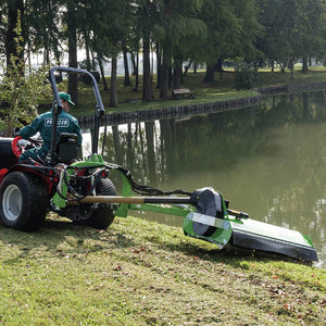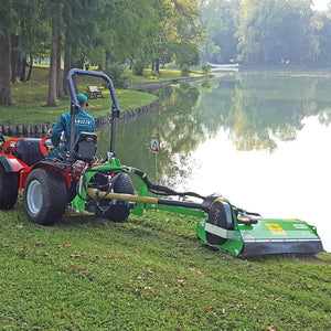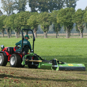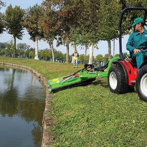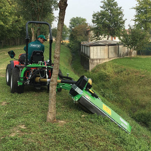 The Peruzzo Fox-Cross1400M rear-mounted offset flail mower excels in ditch-bank and edge mowing tasks for compact tractors (25–40 HP). With its 53" swath, hydraulic offset up to 48″ displacement, tilt between +90° and -50°, and 44 heavy-duty hammer blades, it delivers clean, efficient cuts even alongside obstacles. Its adjustable trailing roller and PTO clutch further enhance adaptability and safety.