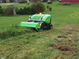 Radio-controlled hybrid flail mower with 47” wide cut; powered by 28 HP Briggs & Stratton engine and electric track motors; operates on slopes up to 50° for safe, remote mulching.