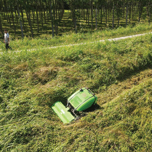 - Self-propelled, remote-controlled mower combining 28 HP petrol engine with dual electric track motors