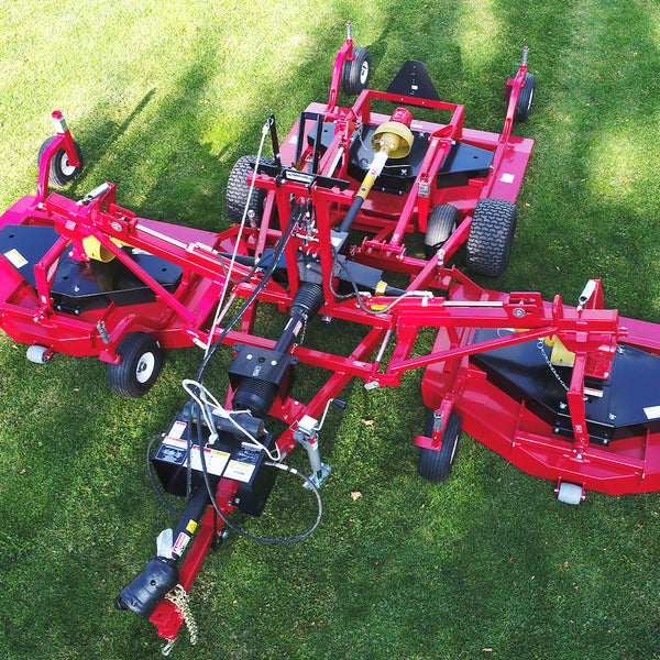 - Tri-deck folding mower offers 15.5′ cutting width and compacts for easy transport on narrow roads or through gates
